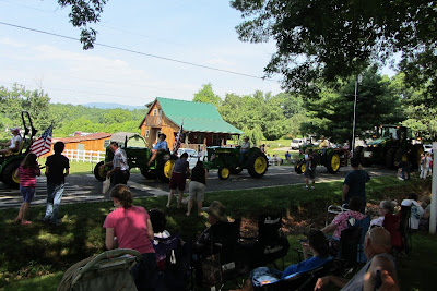 The parade was, as always, amazingly long! All the fire departments had their emergency vehicles sparkling and sirens blaring, there was every imaginable variety of tractor, John Deere and otherwise, and Ed had a field day identifying old cars! And there were family floats (I particularly liked the one under the tractor picture, which included a wading pool with two small children swimming in it!), horses, and even a few politicians. Good fun.